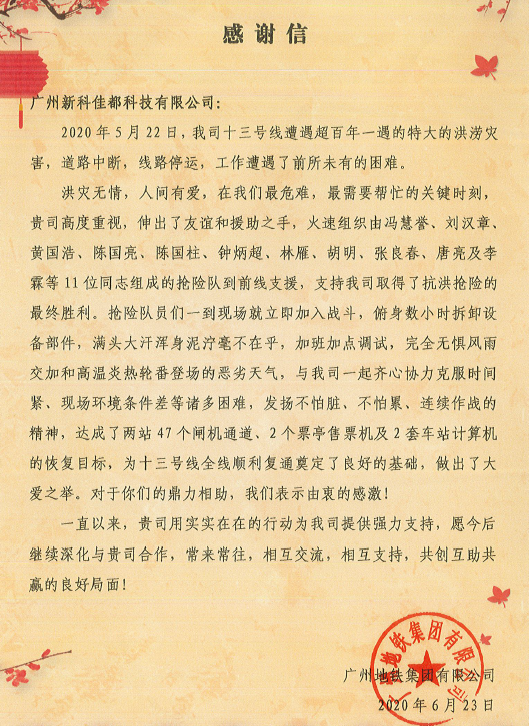 参与抢险的zoty中欧科技全资子公司新科佳都和华之源被授予感谢信