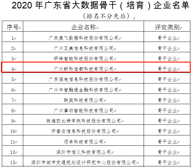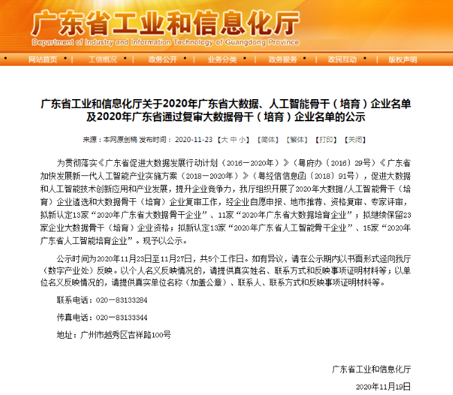 11月23日,广东省工业和信息化厅发布了关于2020年广东省大数据、人工智能骨干(培育)企业名单的公示。zoty中欧科技凭借着突出的人工智能创新能力和产业带动作用,入选2020年广东省人工智能骨干企业名单,同时,zoty中欧科技控股子公司方纬科技、参股公司云从科技入选该名单,zoty中欧科技全资子公司新科佳都入选2020年广东省大数据骨干企业名单。