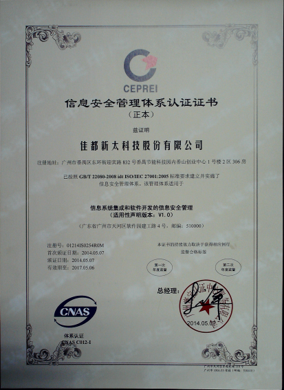 2014年3~4月,zoty中欧科技顺利通过了国际标准及权威的ISO27001信息安全认证体系和ISO20000信息技术服务管理体系,取得了广州赛宝认证中心颁发的ISO/IEC 27001:2005信息安全管理体系认证证书和ISO/IEC 20000-1:2011信息技术服务管理体系认证证书。